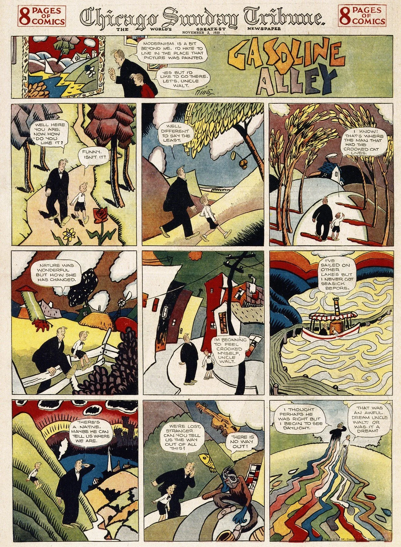 Frank King’s Gasoline Alley stands as one of the most visually and emotionally resonant newspaper comic strips in the history of the medium. King’s meticulously crafted backgrounds are never mere decoration; they enrich the atmosphere of each strip, subtly reinforcing its tone and emotional undercurrents. In the later stages of his career, King began experimenting with form and composition, engaging in a dialogue with the evolving artistic movements of his era. Gasoline Alley exemplifies how exceptional comics can expand the boundaries of the medium, challenging and redefining expectations of what comics can achieve both aesthetically and narratively.